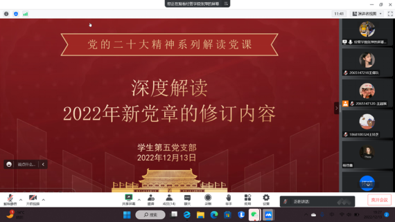 高瞻远瞩绘蓝图,踔厉奋发谱新篇。为深入学习宣传贯彻党的二十大精神,引导支部党员牢固树立党章意识,全面理解党章内容,时刻遵守并践行党章,2022年12月13日晚,永利3044集团官网员工第五党支部组织开展党的二十大精神系列党课之学习《中国共产党章程(修正案)》。由党支部书记主讲,全体党员参加。