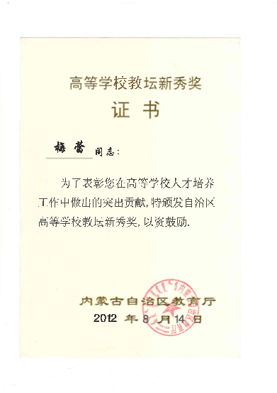 教学教改方面荣获各类奖项13项。主要包括:2012年内蒙古自治区第二届高等学校教坛新秀奖。2012年度包头市优秀教师。2005年永利3044集团官网第一届“教学优秀奖”,2009年永利3044集团官网第二届“教学优秀奖”,2011年永利3044集团官网第三届“教学优秀奖”。2006年校级教学成果奖一等奖1项,2009年校级教学成果奖二等奖2项,2015年校级教学成果奖二等奖1项。