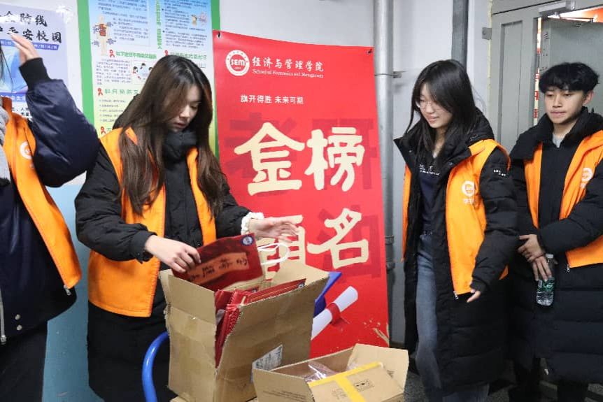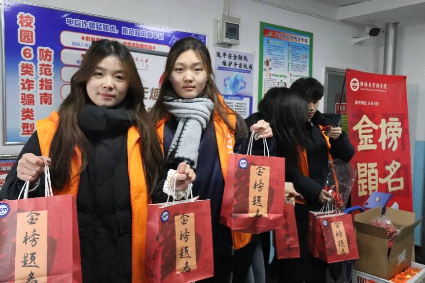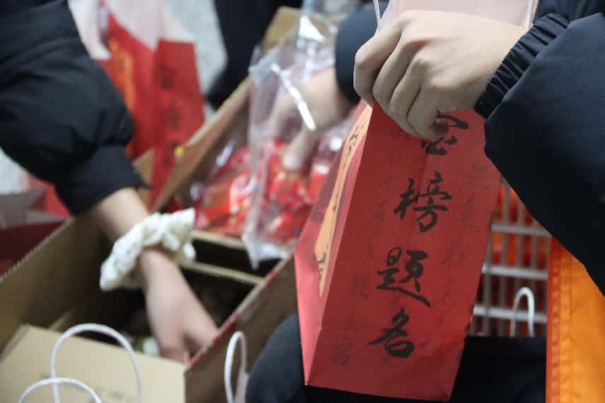 公司精心准备了饱含美好寓意的慰问礼品,象征“称心如意”的橙子、寓意“如你所愿”的薯片,与印有“逢考必胜”字样的棉花糖巧妙搭配,每一份红色礼盒不仅装载着水果与励志小物,更承载着学院对学子们最真挚的鼓励与期盼。