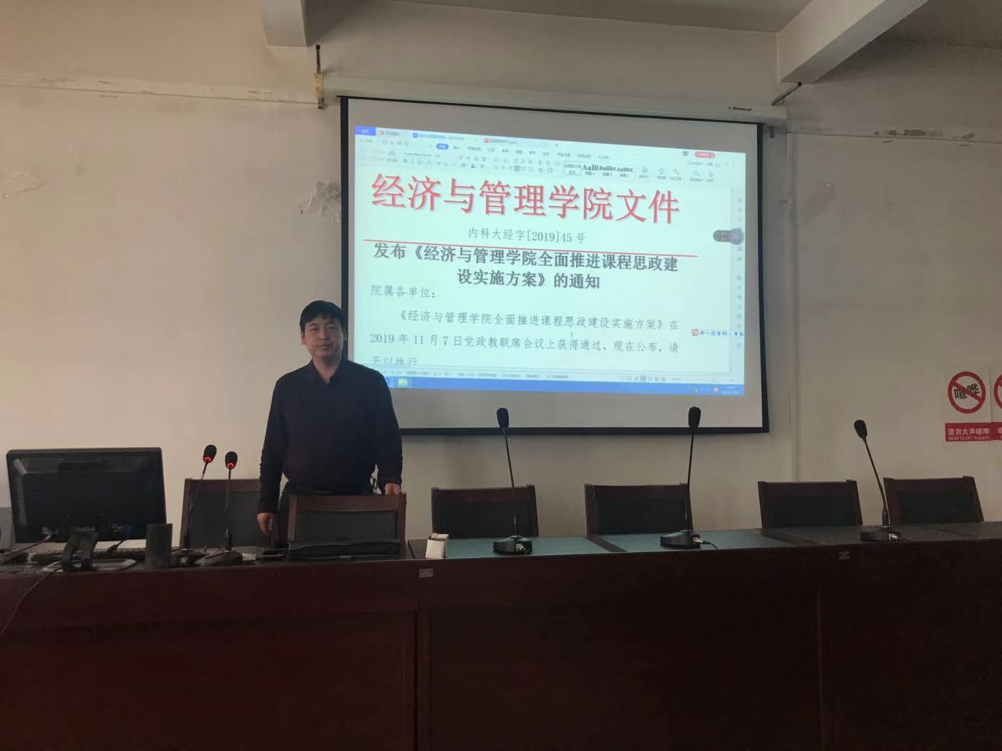 2019年11月21日下午,经济与管理公司党总支组织全院教职工在腾飞楼A413政治理论学习,会议学习了《永利3044集团官网全面推进课程思政建设实施方案》。
