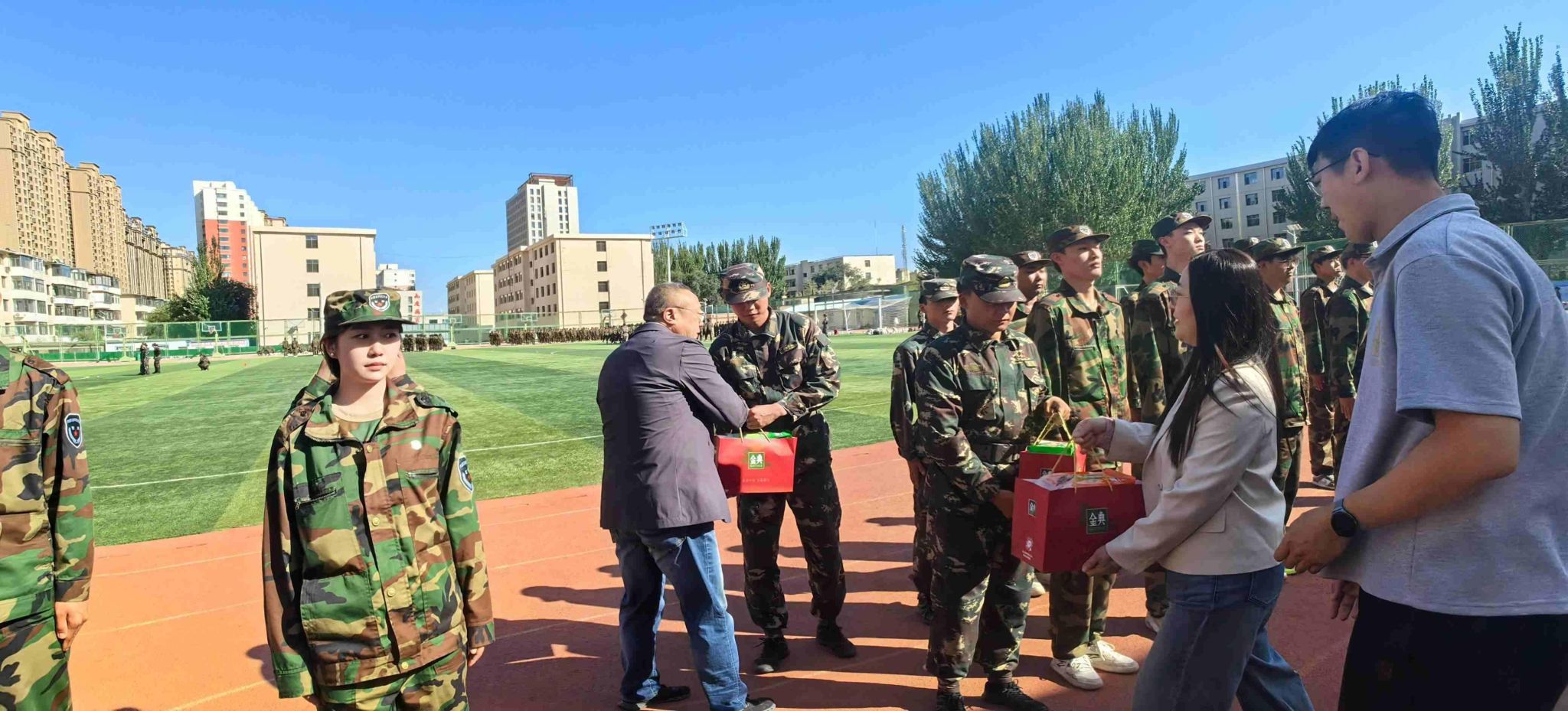 9月24日下午,公司党委书记张永强、副书记田芳、新生班主任及学工办辅导员一行深入军训场地看望现场军训师生,为刻苦训练的学子们送上学院的点赞与关怀,也对教官和教导员们在现场的默默付出予以肯定和支持。