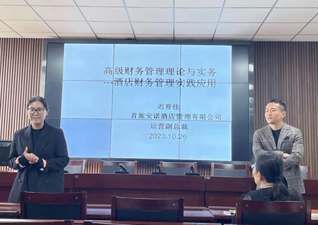 本次讲座有幸邀请到了首旅安诺酒店管理有限公司运营副总裁迟育佳,讲座由公司工商管理系主任郝婷主持,参加本次讲座的还有苏利平教授、王晓红副教授、张芳卿副教授、昝玉文和尚丽花等教师以及2023级会计专硕研究生。