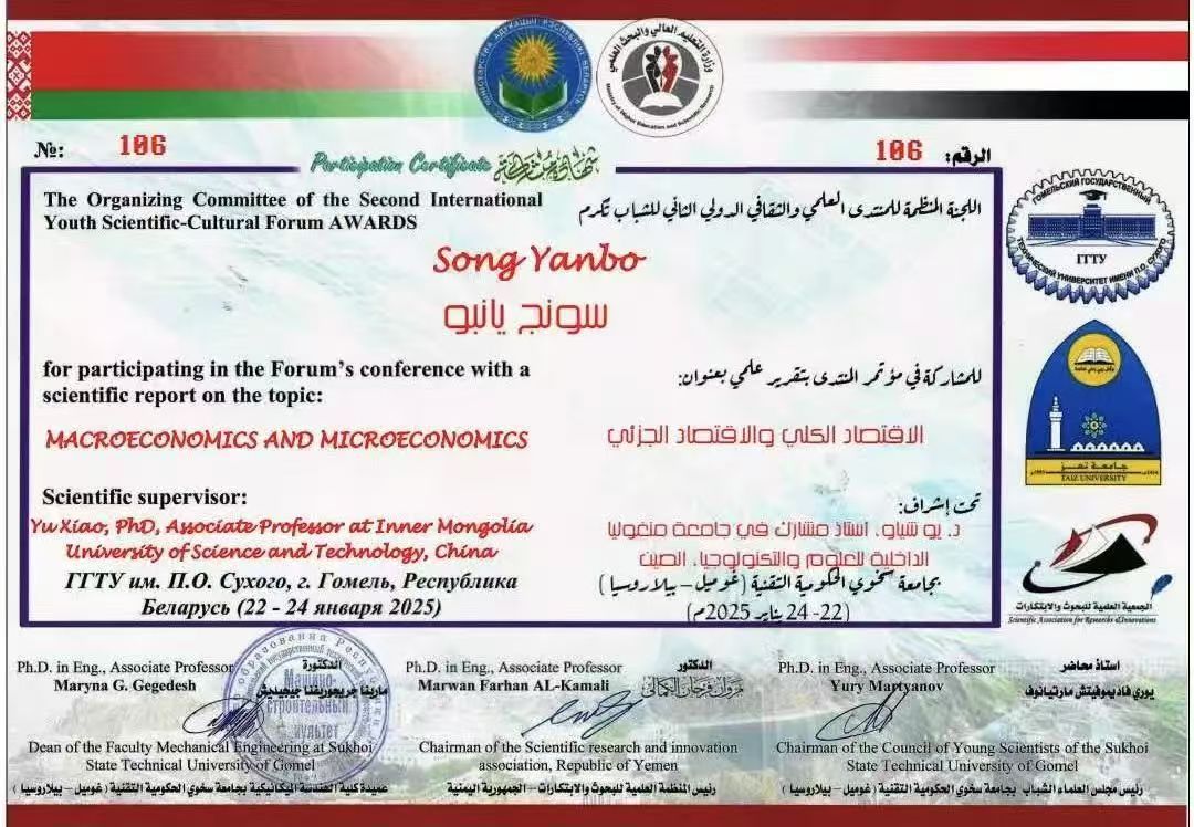 近日,第二届青年科学文化论坛在白俄罗斯戈梅利国立技术大学举行。公司2024级国际经济与贸易专业员工宋彦博参加活动,其撰写报告“MACROECONOMICS AND MICROECONOMICS”获第二届国际青年科学文化论坛组织委员会颁发的优秀论文证书。