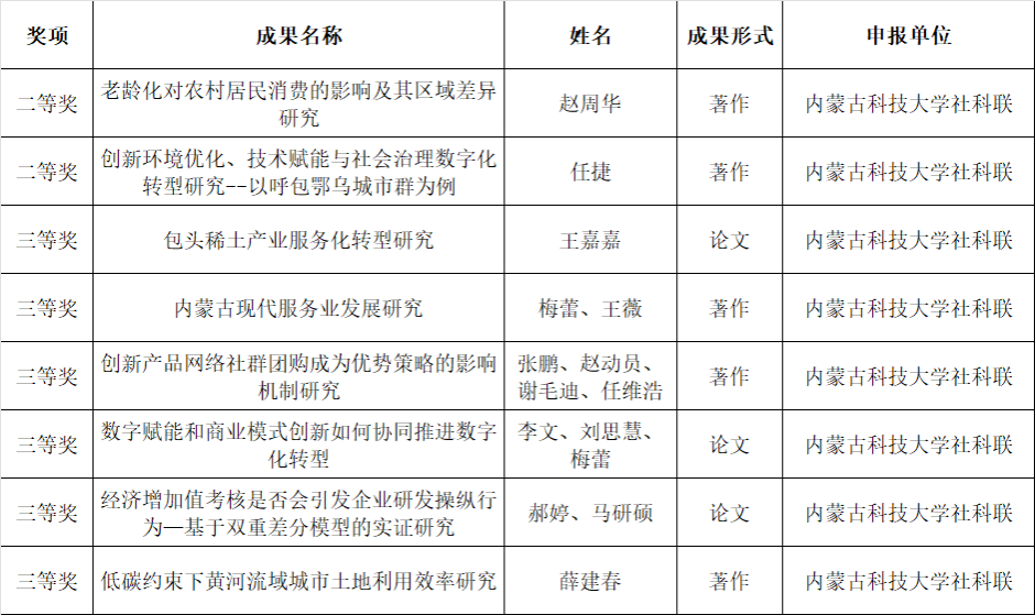 近日,内蒙古自治区社会科学界联合会发布《关于第十一届内蒙古自治区哲学社会科学奖评选结果的公示》,公司教师8项科研成果获奖,其中二等奖2项、三等奖6项,创近年最好成绩,充分展现了公司哲学社会科学研究的实力和活力。 此次获奖成果涵盖经济学、管理学、社会学等多个领域,紧扣国家重大战略和自治区、包头市发展需求,既有理论深度,又有实践价值。学院未来将持续推进有组织科研,鼓励跨学科协同攻关,力争产出更多高水平成果,为自治区经济社会发展贡献力量。
