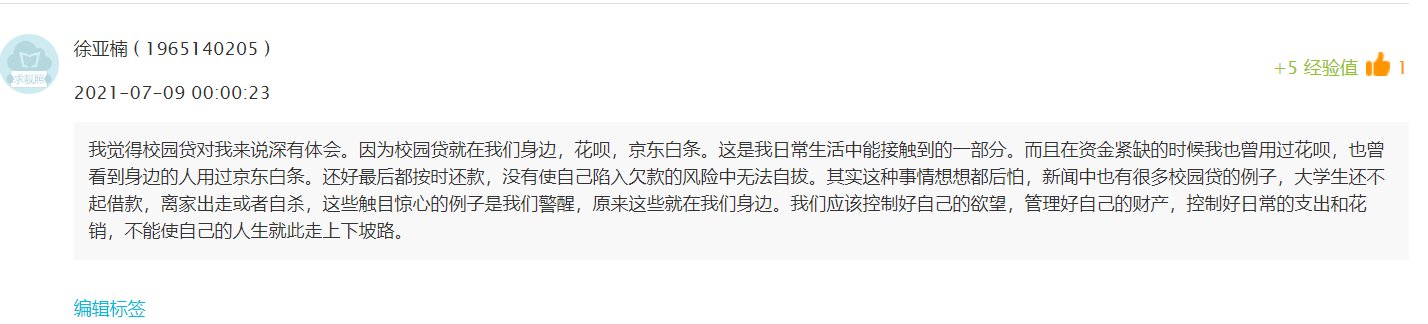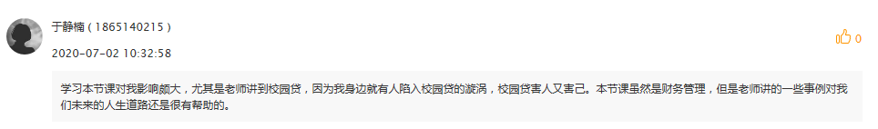 本课程在课程结束时,要求员工对课程中给涉及到的几个课程思政点的讨论进行感悟分享。通过员工在线上留言的反馈,大部分员工对校园贷的案例有很深的印象,通过资料查询和计算了解到校园贷的危害,起到了课程设计想要达到的知识、能力、素质目标。